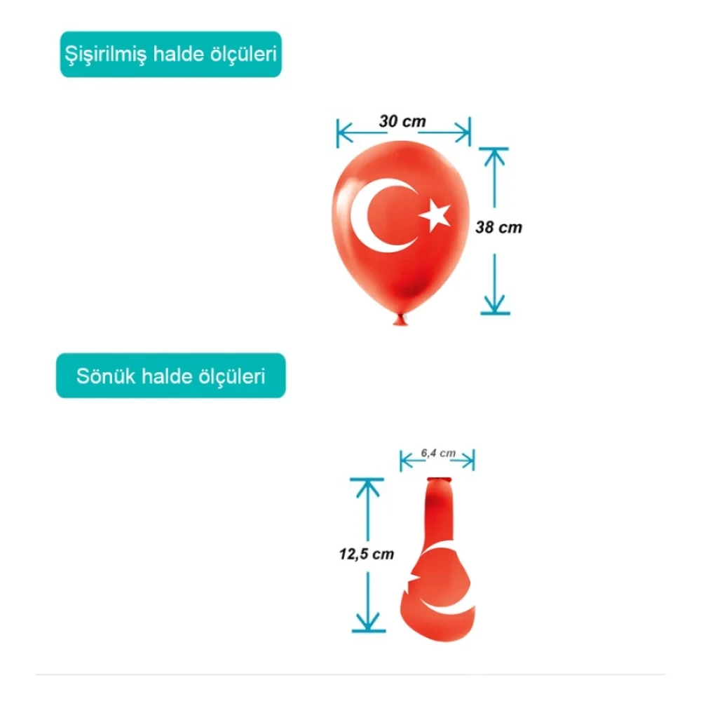 Ay Yıldız Baskılı Pastel Balon İle Bayram Coşkusu Yaşayın Ay Yıldız baskılı pastel balon ile birlikte Milli Bayram coşkusunu hissedin. Özel olarak hazırlanan balonlar ile her zaman coşkulu bir bayram kutlaması yaşayabilirsiniz. Ay Yıldız Baskılı Pastel Balon İle Dekorasyon Nasıl Yapılır? Harika renk tonu ile üretilen Ay Yıldız baskılı pastel balon milli bayram dekorasyonlarında yer verebileceğiniz bir tasarımdır. Ay Yıldız baskılı pastel balon 11” boyutlarındadır. Uçan balon özelliği kazanması için helyum ile şişirmeniz gereklidir. Balon standı tercih ederek, masa yanı ya da masa üzerinde farklı renk balonlar ile birlikte kullanabilirsiniz. Balon zinciri tercih ederek dilediğiniz gibi dekorasyonda yer verebilirsiniz. Balon pompası yardımı ile hızlı şekilde şişirebilirsiniz. Balonların şık bir görüntü sunması açısından beğendiğiniz bir rafya ile bağlayabilirsiniz. Balon kemeri yapım seti tercih ederek, büyük organizasyonlarda tüm dikkatleri toplayabilirsiniz. Balon çubukları tercih ederek, törenlerde çocuklara dağıtabilirsiniz. Milli Bayramlarda coşkulu bir konsept oluşturmak açısından balon aksesuarlarına göz atabilir ve aksesuarlar ile birlikte görünümü daha eğlenceli bir hale getirebilirsiniz. Ay Yıldız Baskılı Balon Fotoğraftaki Gibi Mi Gelecek? Ay Yıldız baskılı balon balon modelimiz de diğer tüm ürünlerimiz gibi fotoğraftaki görüntünün aynısıdır. Fotoğrafların tümü kendi stüdyolarımızda çekilmekte olup, flaş kaynaklı küçük ton farklılıkları dışında birebir aynı üründür. Not: Balonlar tarafınıza şişirilmemiş olarak gönderilecektir. Yasal Uyarı: 8 yaşından küçük çocukların şişirilmemiş balonlar ile oynaması boğulma riskini doğurur. Yetişkin gözetimi gereklidir. Şişirilmemiş ve patlak balonları çocuklardan uzak tutunuz.
