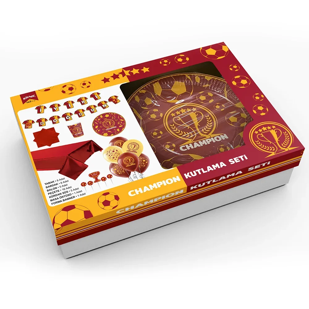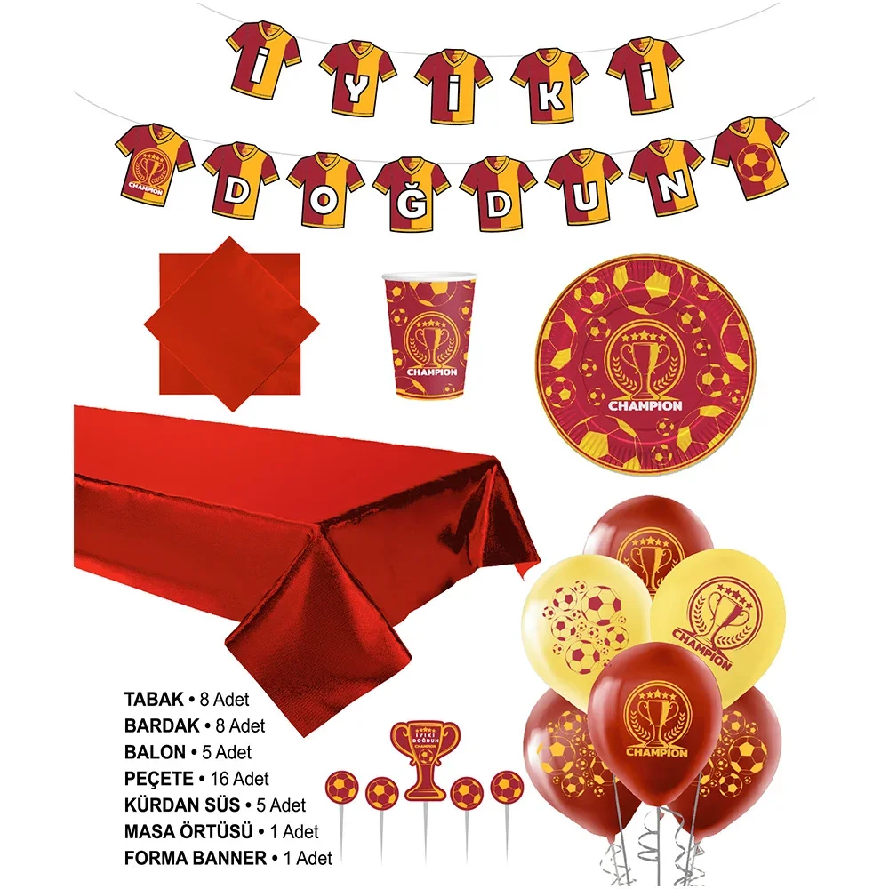 Champion Sarı Kırmızı Kutlama Seti Özellikleri Doğum Günü organizasyonlarda kullanarak özel bir ortam süslemesi yapabilir ve sofra düzeni oluşturabilirsiniz. Ürün İçeriği; 8 adet tabak 8 adet bardak 5 adet balon 16 adet peçete 5 adet kürdan süs 1 adet masa örtüsü 1 adet forma banner