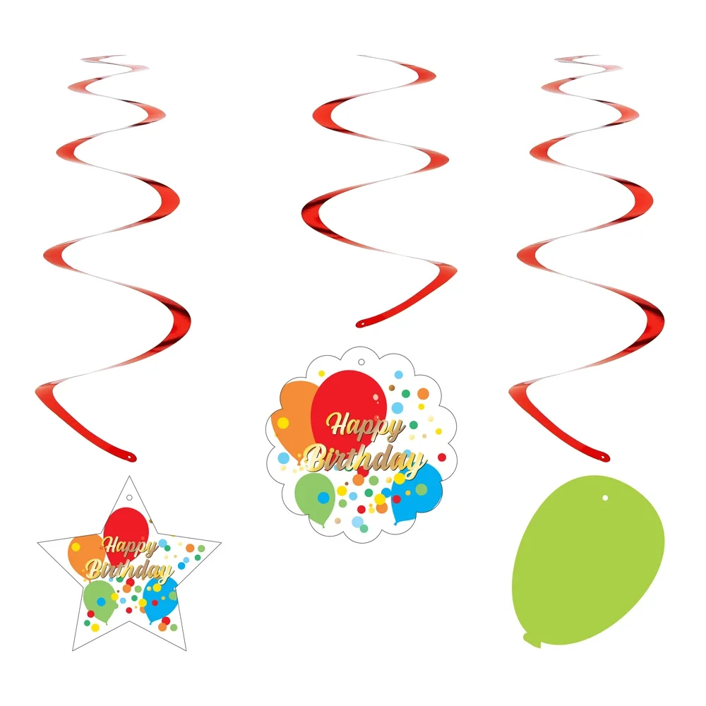 Happy Birthday Spiral Sarkıt Süs • Ürün Ölçüsü: Bulut Süs: ( 16,5 x 16,8 cm )x2 Yıldız Süs: ( 16,4 x 15,6 cm )x2 Balon Süs: ( 13,7 x 15,4 cm )x2 Spiral: 60 cm • Materyal : Kağıt • Paket İçi Miktar : 6 Adet