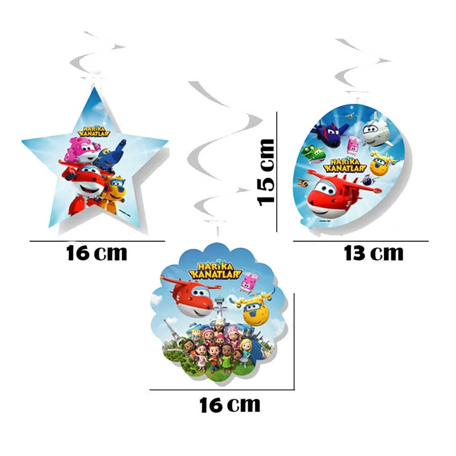 Harika Kanatlar Sarkıt Süs • Organizasyonlarınıza renkli bir dokunuş katmak için Harika Kanatlar temalı sarkıt süs harika bir üründür. • Ürün Ölçüsü: Bulut Süs: 16 cm ( 2 adet ) Yıldız Süs: 16 cm ( 2 adet ) Balon Süs: 13 x 15 ( 2 adet ) • Materyal : Kağıt • Paket İçi Miktar : 6 Adet