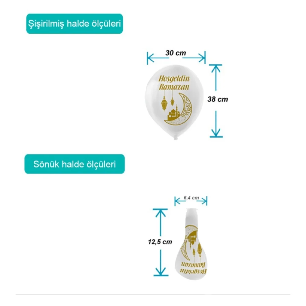 Hoşgeldin Ramazan Baskılı Pastel Balon İle Ramazan'ı Karşılayın Hoşgeldin Ramazan baskılı pastel balon ile birlikte müslümanlar açısından kutsal olarak kabul edilen Ramazan ayını karşılayabilirsiniz. Hoşgeldin Ramazan Baskılı Pastel Balon İle Dekorasyon Nasıl Yapılır? Harika renk tonu ile üretilen Hoşgeldin Ramazan baskılı pastel balon Ramazan ayına özel olarak hazırlanmaktadır. Hoşgeldin Ramazan baskılı pastel balon 11” boyutlarındadır. Uçan balon özelliği kazanması için helyum ile şişirmeniz gereklidir. Balon standı tercih ederek, masa yanı ya da masa üzerinde farklı renk balonlar ile birlikte kullanabilirsiniz. Balon zinciri tercih ederek dilediğiniz gibi dekorasyonda yer verebilirsiniz. Balon pompası yardımı ile hızlı şekilde şişirebilirsiniz. Balonların şık bir görüntü sunması açısından beğendiğiniz bir rafya ile bağlayabilirsiniz. Balon kemeri yapım seti tercih ederek, büyük organizasyonlarda tüm dikkatleri toplayabilirsiniz. Balon çubukları tercih ederek, törenlerde çocuklara dağıtabilirsiniz. Ramazan ayının ruhuna özel bir konsept oluşturmak açısından balon aksesuarlarına göz atabilir ve aksesuarlar ile birlikte görünümü daha eğlenceli bir hale getirebilirsiniz. Hoşgeldin Ramazan Baskılı Balon Fotoğraftaki Gibi Mi Gelecek? Hoşgeldin Ramazan baskılı balon balon modelimiz de diğer tüm ürünlerimiz gibi fotoğraftaki görüntünün aynısıdır. Fotoğrafların tümü kendi stüdyolarımızda çekilmekte olup, flaş kaynaklı küçük ton farklılıkları dışında birebir aynı üründür. Not: Balonlar tarafınıza şişirilmemiş olarak gönderilecektir. Yasal Uyarı: 8 yaşından küçük çocukların şişirilmemiş balonlar ile oynaması boğulma riskini doğurur. Yetişkin gözetimi gereklidir. Şişirilmemiş ve patlak balonları çocuklardan uzak tutunuz.