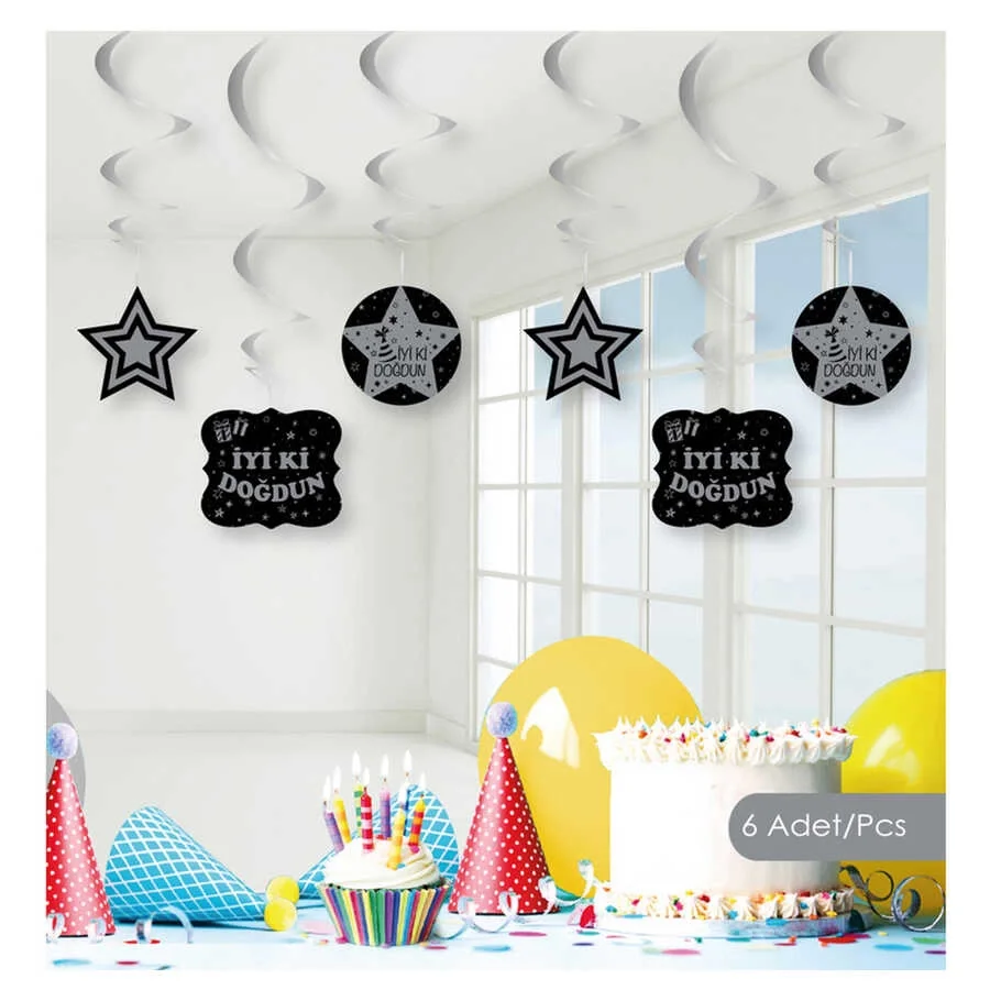 İyi Ki Doğdun Gümüş Spiral Sarkıt Süs • Ürün Ölçüsü: Bulut Süs: ( 16,5 x 16,8 cm )x2 Yıldız Süs: ( 16,4 x 15,6 cm )x2 Balon Süs: ( 13,7 x 15,4 cm )x2 Spiral: 60 cm • Materyal : Kağıt • Paket İçi Miktar : 6 Adet