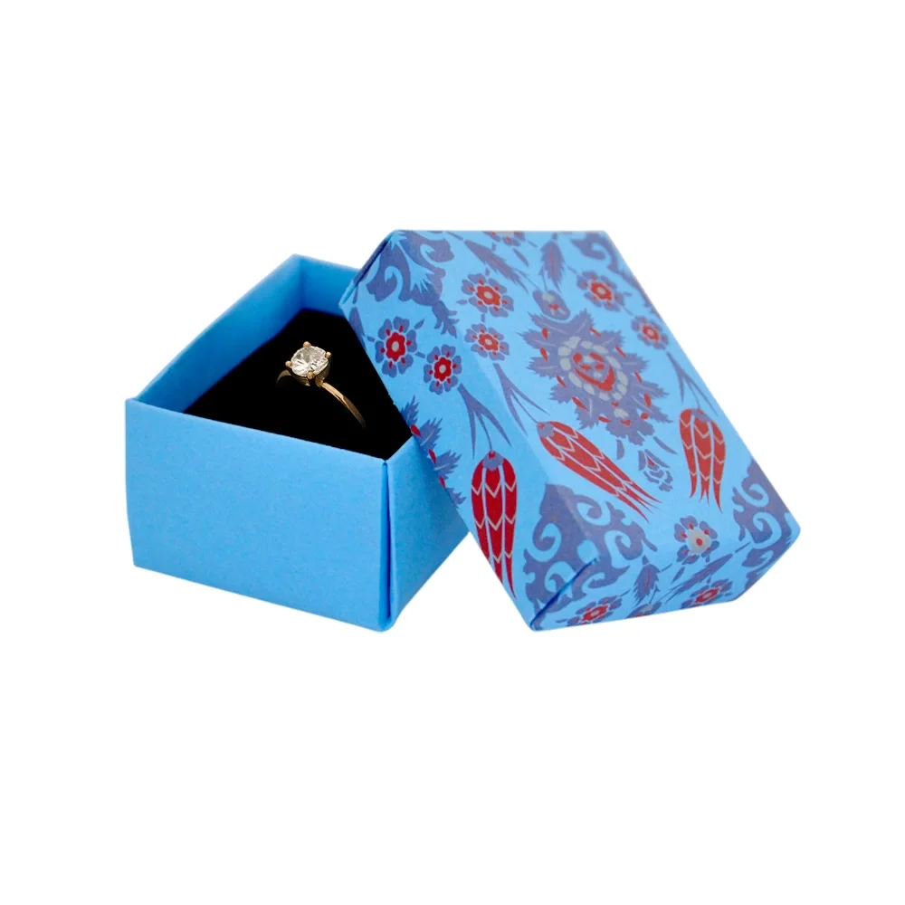Mavi Lale Desen Yüzük Kutusu Mavi lale desen yüzük kutusu ile satışını yaptığınız yüzükleri müşterilerinize sunabilirsiniz. Farklı organizasyonlarda davet ettiğiniz misafirlerinize dağıtacağınız hediyelikler için tercih edebilirsiniz. Kutu içerisinde gömme sünger yer aldığı için hediyelerinizi güvenle saklayabilir ve sevdiklerinize ulaştırabilirsiniz. Materyal: Lüks Karton Ürün Ölçüsü: 60x45x30 mm Karton Ağırlığı: 230 gr