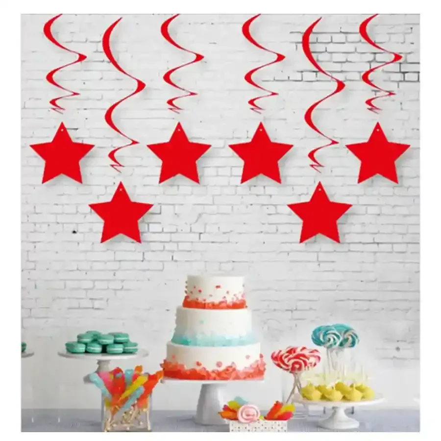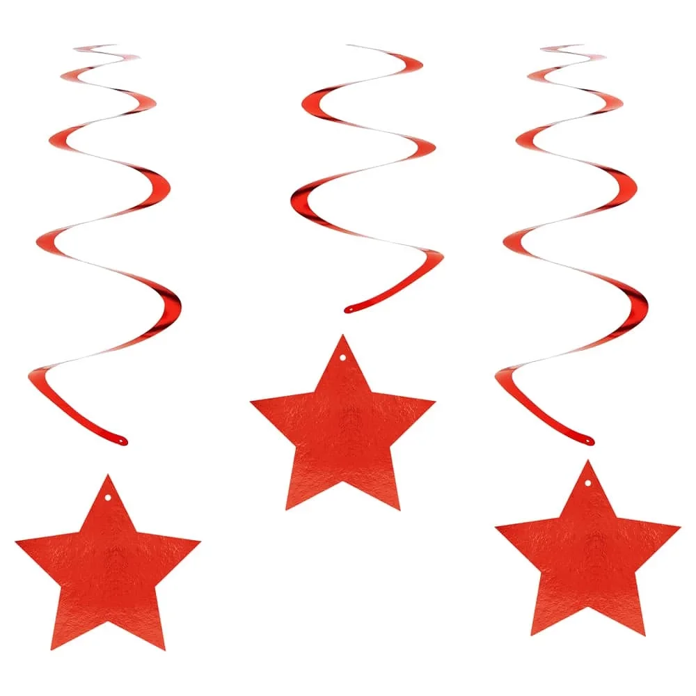 Metalize Yıldız Spiral Sarkıt Süs • Organizasyonlarınıza renkli bir dokunuş katmak için kırmızı metalize yıldız spiral sarkıt süs harika bir üründür! • Ürün Ölçüsü: Yıldız Süs: ( 13,5 cm )x6 ; Spiral: 60 cm • Materyal : Kağıt • Paket İçi Miktar : 6 Adet