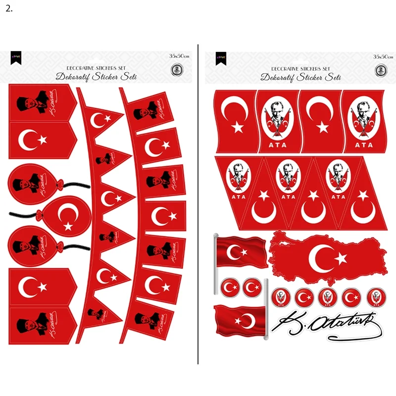 Dekoratif Sticker Seti - Milli Bayramlar Milli Bayramlar dekoratif sticker seti ile harika süslemeler yapabilirsiniz. 35x50 cm ölçülerinde 2 sayfa sticker yer almaktadır. Sticker boyutları birbirinden farklı olarak hazırlanmıştır. Setimiz özel kesimlidir. Dilediğiniz gibi camınıza ya da duvarınıza yapıştırabilirsiniz. Tüm düz yüzeylerde kullanılabilir. Uygulama öncesinde talimatlar kısmındaki yönergeleri uygulayınız. Temiz ve pürüzsüz her zemine kullanım için uygundur. Kendiliğinden yapışkanlı malzemesi sayesinde zemine kolayca yapışır. Tüm ürünlerimizde sağlığa zararsız boyalar kullanılmaktadır. Çıkarmak istediğinizde fön makinesi ile ya da hafifçe elinizi sürtüp ısıtarak duvarınızdan ya da camınızdan kolayca çıkarabilirsiniz. Talimatlar Sadece pürüzsüz yüzeyler için uygundur. Uygulanacak yüzey temiz ve kuru olmalıdır. Stickerı tabakadan yırtmadan dikkatlice ayırınız. Stickerın ilk olarak üst kısmını yapıştırıp, sonrasında aşağıya doğru yavaşça yapıştırarak ilerleyin.