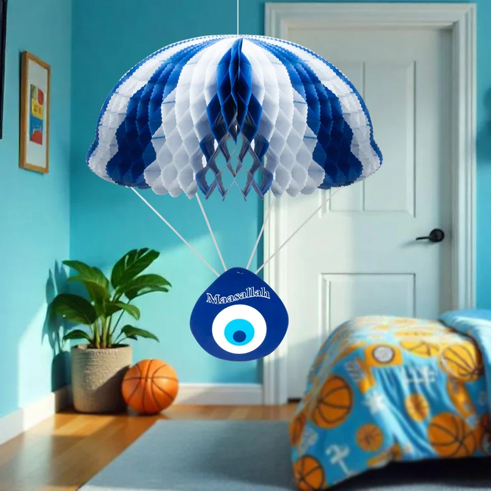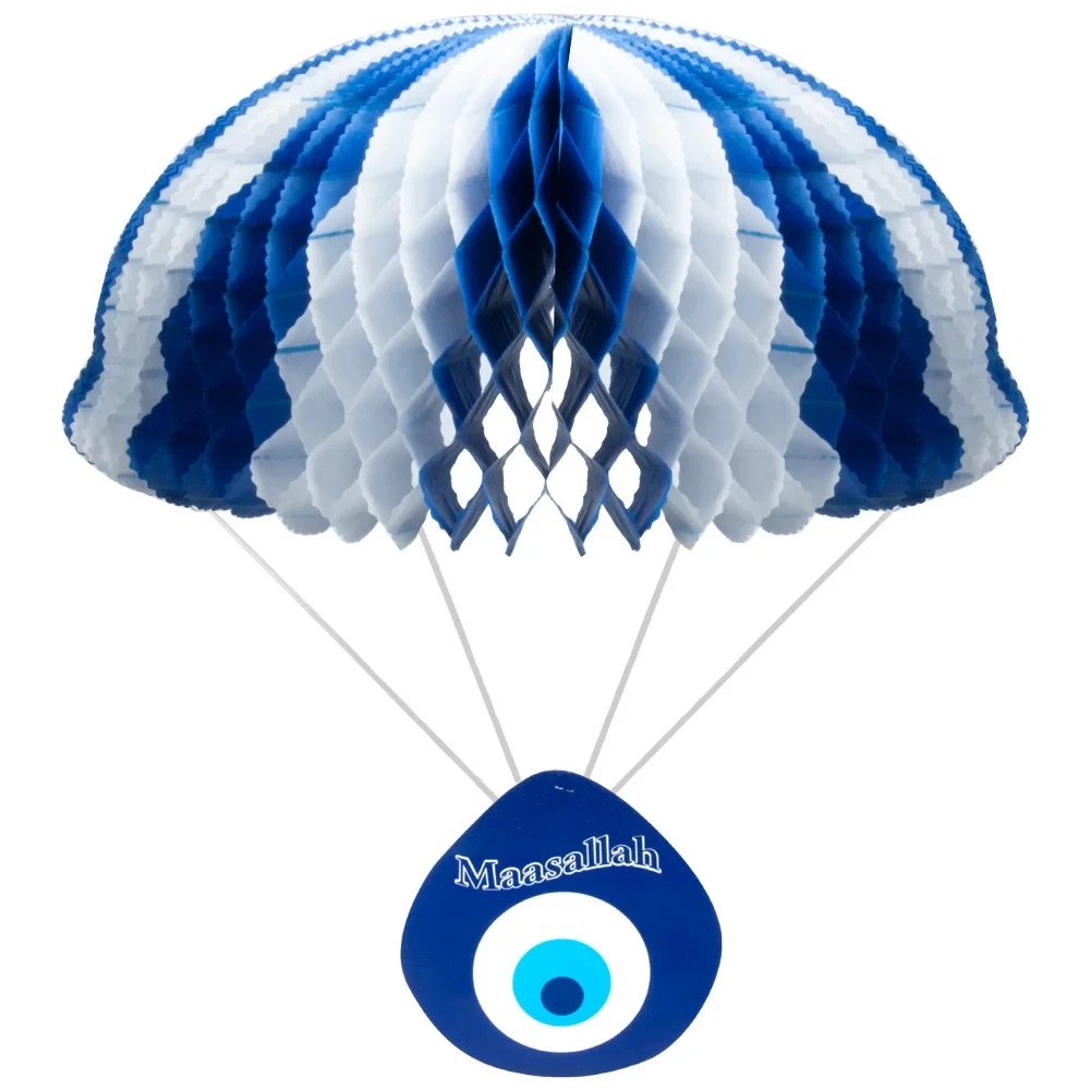 Nazar Boncuklu Paraşüt Petek Süs Paket İçi Miktarı: 1 Adet Ürün Ölçüleri: 35 x 55 cm Ürün müşteri tarafından şekillendirilecektir. Ürünümüz beyaz ip ile gönderilecektir, görseldeki gibi gri ip ile gönderilmeyecektir. Petek Süs Supertrendjoy özel tasarımıdır. Doğum günlerinin ve partilerin vazgeçilmezi Petek Süslerle ortama hava katın!
