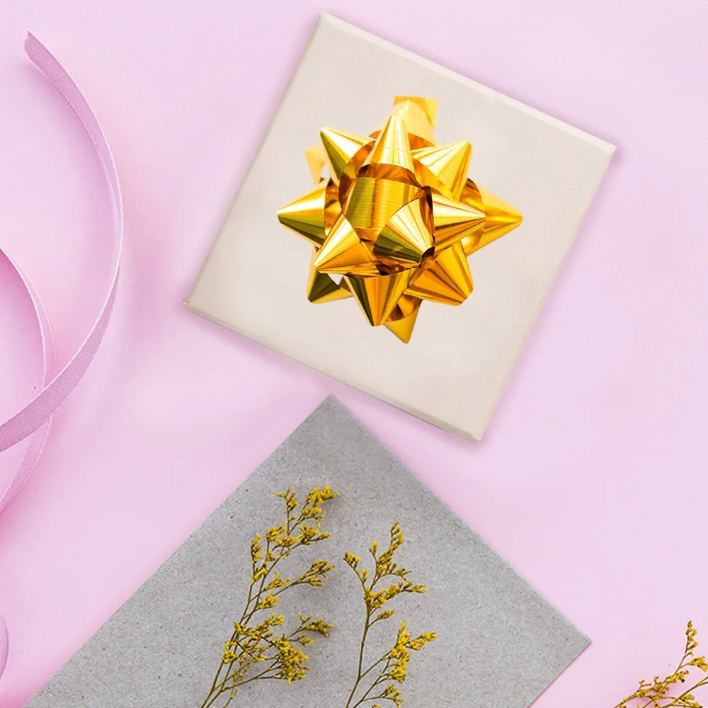 No:5 Altın Metalik Hediye Paketi Süsü Modelleri Metalik altın hediye paket süslerini hediye paketlemeleriniz için kullanabilirsiniz. Paket süslerinin arka bölümü yapışkanlıdır, kolaylıkla her yüzeye yapıştırabilirsiniz. No:5 Altın Metalik Hediye Paketi Süsü Özellikleri; Ürün Ölçüsü: 5 cm Materyal: Rafya