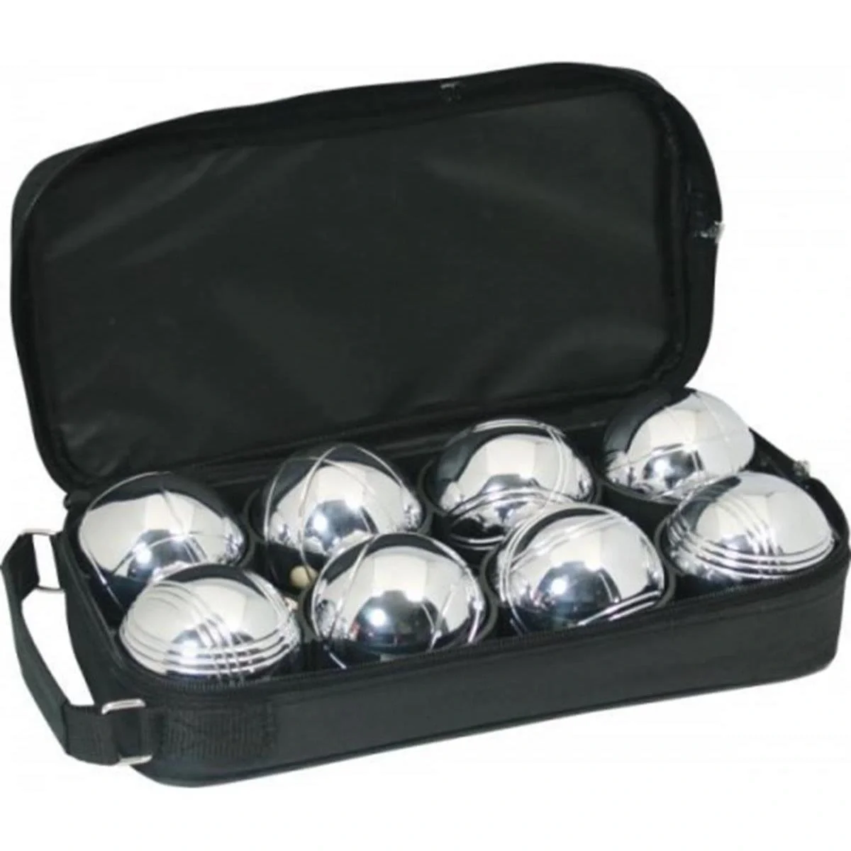 1 adet pallino topu ve 8 adet 7 cm çapında nikelaj kaplama bocce topundan oluşan imperteks çantasında