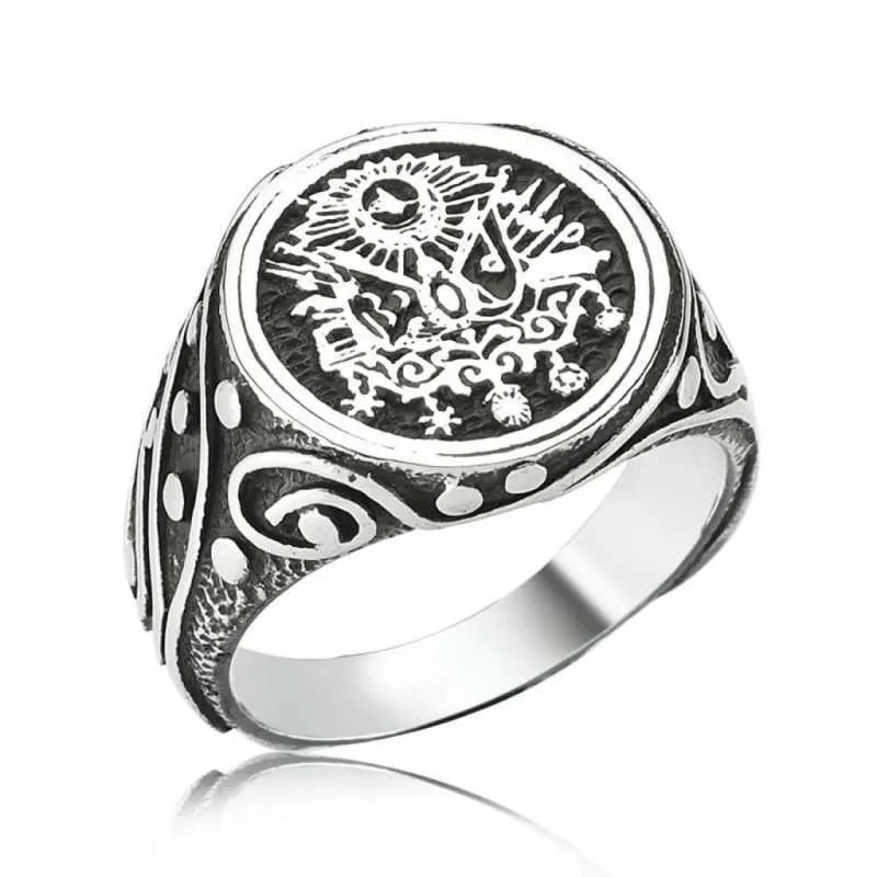 Osmanlı İmparatorluğu Devlet Arması, 19. yüzyılda Osmanlı Devleti için hazırlanmıştır. Ondan önce, padişahların tuğraları devlet nişanı yerine geçiyordu. Osmanlı nişanının son halini 1882"de Sultan II. Abdülhamit tarafından yürürlüğe konmuştur. Osmanlı Devlet Nişanı"nın içinde iki tane bayrak vardır. Kırmızı zeminde ay-yıldız bulunan bayrak Osmanlı Hanedanı"nı, yeşil zemindeki bayrak İslam halifeliğini simgelemektedir. Terazi, Osmanlı adaletini, terazide bulunan kitaplar da adaletin kaynağı olan Osmanlı kanunnamelerini ve Kur"an-ı Kerim"i temsil etmektedir. Bu şık yüzüğü sevdiklerinize doğum günlerinde, özel günlerde veya babalar gününde hediye edebilir onları sevindirebilirsiniz. Bu özel tasarım erkek yüzük modeli 925 ayar gümüşten imal edilmiştir. Gümüş üzerine oksit kaplama yapılmıştır. Tüm gümüş erkek yüzüklerinde olduğu gibi gümüş osmanlı devlet armalı erkek yüzük modeli de el emeği ile üretilmiştir. Gümüş ve değerli taşlar nedeniyle belirtilen ortalama ürün ağırlığında ± %10 sapma olabilmektedir.