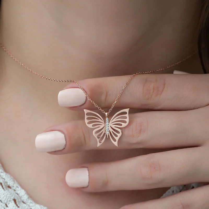 Kelebek; kadınlarca tercih edilen en popüler motiflerden biridir. Sevenlerine doğanın gizemini ve insan hayal gücünün zenginliğini hatırlatır. Özgürlüğü masumiyeti ve saflığı simgeleyen bahar kelebeği, tertemiz sevginin ve aşkın ifadesidir. Sizin olduğu kadar sevdiklerinizin de keyifle takacağı bahar kelebeği bayan kolye, sevdiğinize en güzel hediyelerden biri olacaktır. Kolye 925 ayar gümüşten imal edilmiştir. Gümüş üzerine rose altın kaplama yapılmıştır. Rose altın kaplama yapılan gümüş bayan kolyeler parlaklığını uzun süre muhafaza eder ve oksitlenmesini geciktirir. Gümüş olan zincir boyu ortalama 45 cm'dir. Tüm gümüş bayan kolyelerde olduğu gibi gümüş rose kelebek bayan kolye modeli de el emeği ile üretilmiştir. Gümüş ve değerli taşlar nedeniyle belirtilen ortalama ürün ağırlığında ± %10 sapma olabilmektedir.