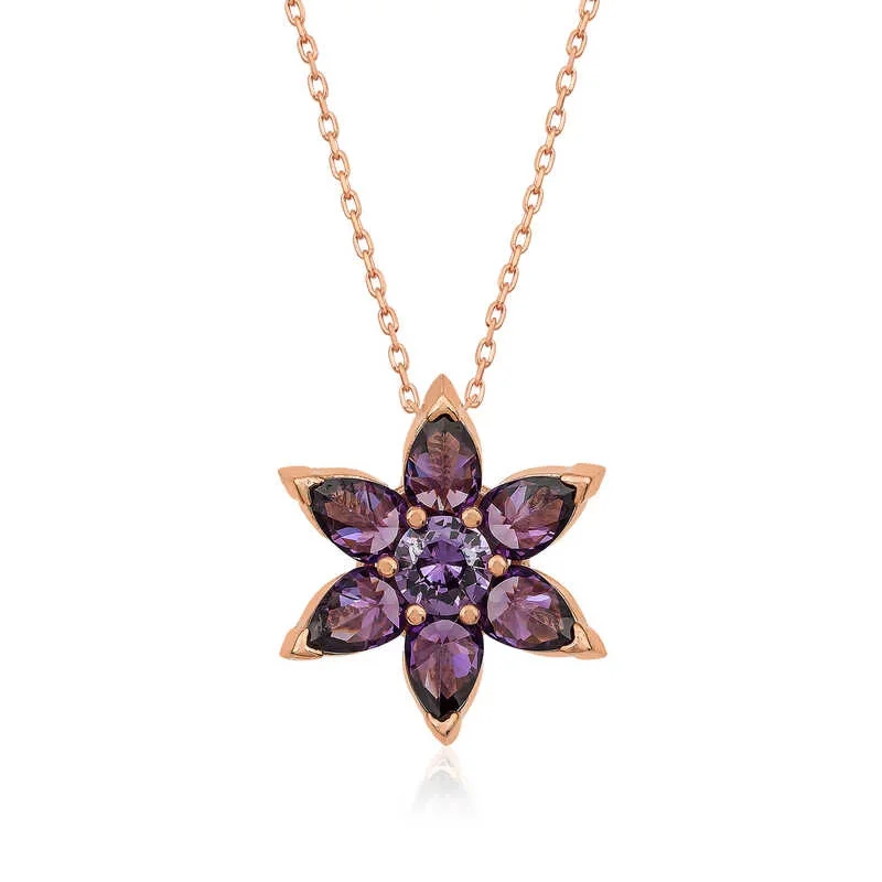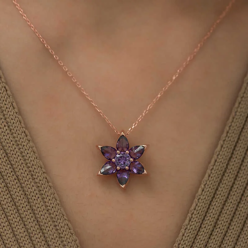 Sevdiklerinize duygularınızı ifade etmenin yolu neden çiçek desenli zarif bir kolye olmasın? Özel zamanlarda O’na gönderebileceğiniz, hediye seçenekleri arasında yer alan bu şık kolye sevdiklerinizi sevindirmenin en güzel yolları arasında yer almaktadır. En kaliteli, en ışıltılı taşlarla hazırlanmış gümüş mor çiçek bayan kolye; sevgisini bir kez daha anlatmak isteyenleri, sen bir çiçeksin demek isteyenleri bekliyor. Bu özel tasarım gümüş mor çiçek bayan kolye 925 ayar gümüşten imal edilmiştir. Gümüş üzerine rose kaplama yapılmıştır. Rose kaplama yapılan gümüş bayan kolye modelleri parlaklığını uzun süre muhafaza eder ve oksitlenmesi gecikir. Gümüş olan zincir boyu ortalama 45 cm"dir. Tüm bayan gümüş kolye modellerinde olduğu gibi gümüş mor çiçek kolye de el emeği ile üretilmiştir. Gümüş ve değerli taşlar nedeniyle belirtilen ürün ağırlığında ± %10 sapma olabilmektedir.