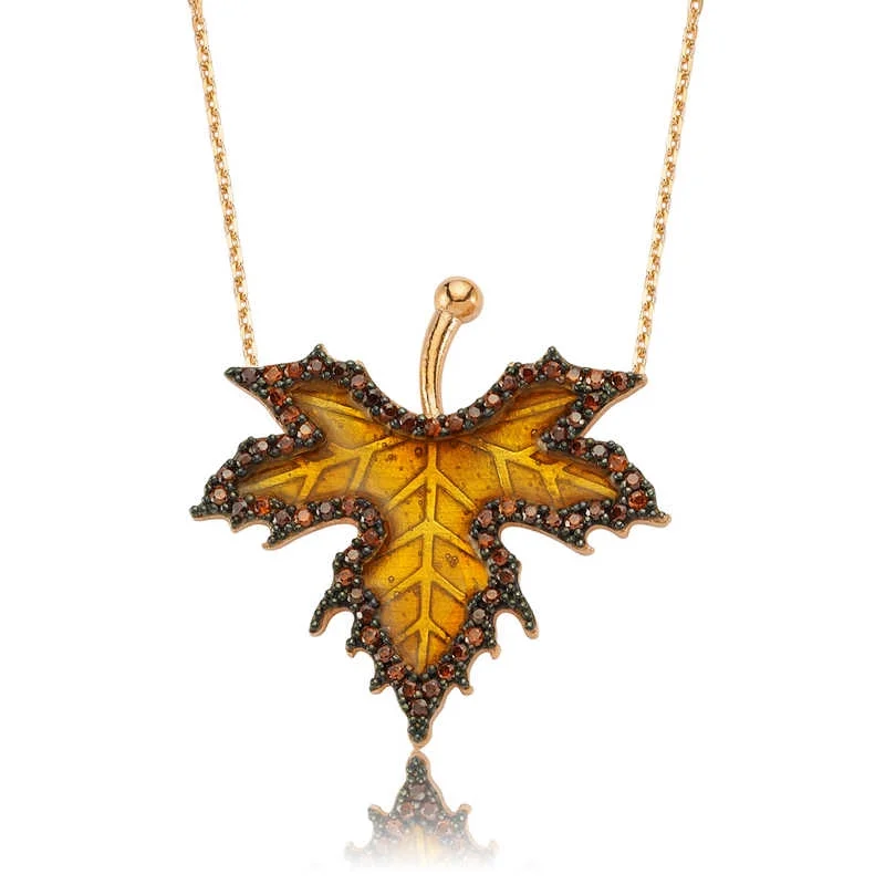 Çınar ağacı, büyüklüğü, dayanıklılığı ve uzun ömürlülüğü ile tarihimizde bir çok sanat eserine ilham kaynağı olmuştur. Sevginizin çınar ağacı gibi uzun ömürlü olduğunu ifade edebileceğiniz güzel hediyelerden biri olacaktır. Gümüş sonbahar çınar yaprağı kolye tasarımı, işçiliği, zirkon taşlarının mine ile mükemmel uyumuyla karşımıza çıkmaktadır. 925 ayar gümüşten imal edilmiştir. Tüm gümüş bayan kolye modelleri gibi gümüş sonbahar çınar yaprağı bayan kolye modeli de el emeği ile üretilmiştir. Gümüş ve değerli taşlar nedeniyle belirtilen ortalama ürün ağırlığında ± %10 sapma olabilmektedir.
