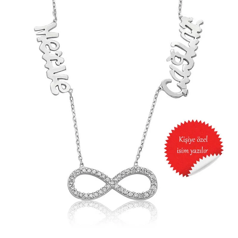 Kişileştirilmiş şık ve zarif bir hediye arayanlar için sevdiklerinizin ismini yazdırarak onları her zaman yanınızda taşıyabilirsiniz.Sonsuzluk kolyesi son günlerde çok daha popüler hale gelirken bundaki en önemli etken bu kolyenin taşıdığı derin anlamın artık pek çok kişi tarafından öğrenilmesidir. Sonsuzluk kolyesi taşıdığı anlam itibari ile sevdiğiniz kişilere hediye edebileceğiniz çok güzel bir hediye seçeneğidir.Sonsuzluk kolyesinin anlamı bu kolyeyi hediye ettiğiniz kişiyi sonsuza kadar seveceğinizdir. Sonsuzluk iki isimli gümüş kolye modeli tamamen el emeği ile üretilmiştir. Gümüş ve değerli taşlar nedeniyle ürün ağırlığında ± %10 sapma olabilmektedir.