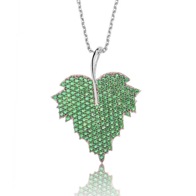 Yaprak deseni tabiattan almakta olduğu kuvveti, saygıyı ve zarafeti simgeler. ""Güçlüyüm ve yeniden doğmayı bilirim"" imajı çizmektedir ve evrene olan saygıyı belirtmektedir. Çiçekler ve bununla birlikte yapraklar, insanoğluna tabiatın verdiği en güzel hediyelerdendir. Doğanın verdiği bu bereketli hediyeyi sevdiklerinizle paylaşmaya ne dersiniz? Gümüş yeşil yaprak bayan kolye sevdiklerinizin teninde hayat bulsun. Yaprak bayan küpe; 925 ayar gümüşten imal edilmiştir. Gümüş üzerine rodyum kaplama yapılmıştır. Rodyum kaplama yapılan ürünler parlaklığını uzun süre muhafaza eder ve oksitlenmeyi geciktirir. Diğer gümüş kolyelerde olduğu gibi gümüş yeşil yaprak bayan kolye de tamamı el emeği ile üretilmiştir. Üzerinde bulunan taşlar zirkondur. Gümüş ve değerli taşlar nedeniyle belirtilen ortalama ürün ağırlığında ± %10 sapma olabilmektedir.