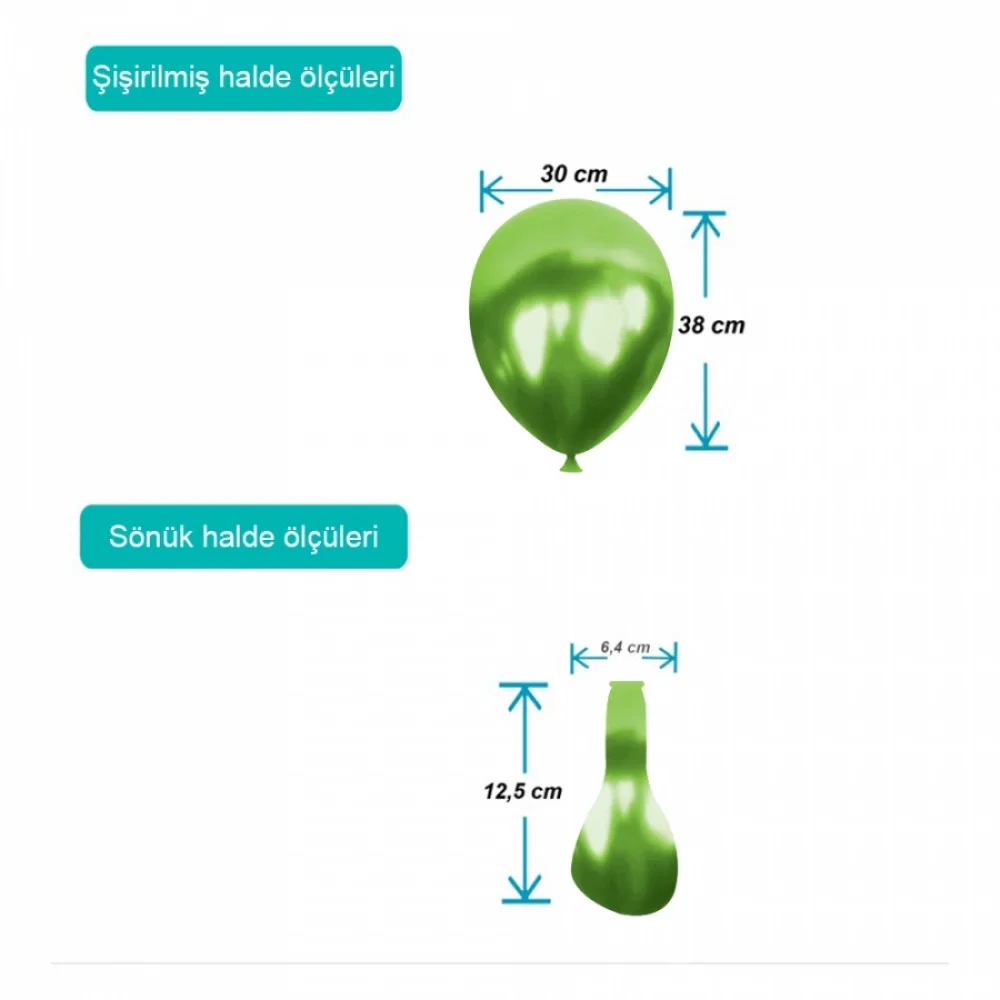Yeşil Metalik Balon İle Parlak Bir Dekorasyon Hazırlayın Yeşil metalik balon ile birlikte doğum günü, mağaza açılışları, evlilik teklifi ya da sünnet gibi tüm organizasyonlarınıza hareket katabilirsiniz. Eğlenceli partiler denildiği zaman ilk akla gelen balonlar olur. Balonlar ile süslenen dekorasyonlar daha hareketli ve coşkulu bir his bırakır. Metalik balonlar mükemmel parlaklıkları ile harika bir görüntü oluştururlar. Yeşil Metalik Balon İle Dekorasyon Nasıl Yapılır? Harika renk tonu ve parlaklığı ile üretilen yeşil metalik balon tüm organizasyonlarda yer verebileceğiniz bir tasarımdır. Birçok farklı renk ile uyumlu olduğu için sevebileceğiniz diğer metalik balon renkleri ile bir arada kullanabilirsiniz. Yeşil metalik balon 12” boyutlarındadır. Uçan balon özelliği kazanması için helyum ile şişirmeniz gereklidir. Balon standı tercih ederek, masa yanı ya da masa üzerinde farklı renk balonlar ile birlikte kullanabilirsiniz. Balon zinciri tercih ederek dilediğiniz gibi dekorasyonda yer verebilirsiniz. Balon pompası yardımı ile hızlı şekilde şişirebilirsiniz. Balonların şık bir görüntü sunması açısından beğendiğiniz bir rafya ile bağlayabilirsiniz. Balon kemeri yapım seti tercih ederek, büyük organizasyonlarda tüm dikkatleri toplayabilirsiniz. Balon çubukları tercih ederek, doğum günü ya da farklı kutlamalarda gelen misafirlere balon dağıtabilirsiniz. Organizasyonlarda eğlenceli bir konsept oluşturmak açısından balon aksesuarlarına göz atabilir ve aksesuarlar ile birlikte görünümü daha eğlenceli bir hale getirebilirsiniz. Yeşil Metalik Balon Fotoğraftaki Gibi Mi Gelecek? Yeşil metalik balon modelimiz de diğer tüm ürünlerimiz gibi fotoğraftaki görüntünün aynısıdır. Fotoğrafların tümü kendi stüdyolarımızda çekilmekte olup, flaş kaynaklı küçük ton farklılıkları dışında birebir aynı üründür. Not: Balonlar tarafınıza şişirilmemiş olarak gönderilecektir. Yasal Uyarı: 8 yaşından küçük çocukların şişirilmemiş balonlar ile oynaması boğulma riskini doğurur. Yetişkin gözetimi gereklidir. Şişirilmemiş ve patlak balonları çocuklardan uzak tutunuz.